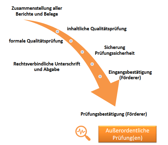 Wenn Sie dann zum Projektende in der Verantwortung stehen, die Abschlussabrechnung und den Verwendungsnachweis fertigzustellen, hilft Ihnen die folgende Grafik, um die einzelnen Arbeitsstufen nachzuvollziehen: